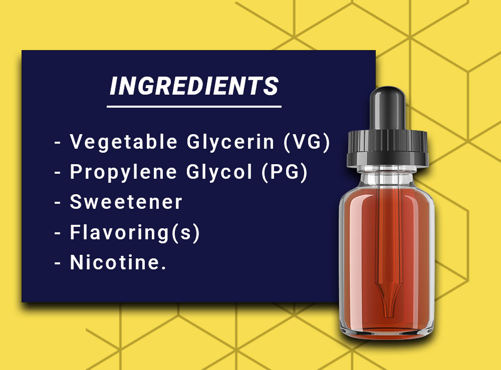 There are mainly 5 different ingredients that are used to make any e-liquids: Vegetable Glycerin (VG), Propylene Glycol (PG), Sweetener, Flavoring(s) and Nicotine. The first two ingredients are what creates the vapour and also provide the throat hit associated with smoking cigarettes; While the last three ingredients are mainly used but are not essential in some mixture.